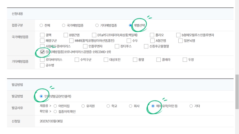 신청내용은 개별선택 > 코로나바이러스-19 (COVID - 19)를 선택해줍니다.